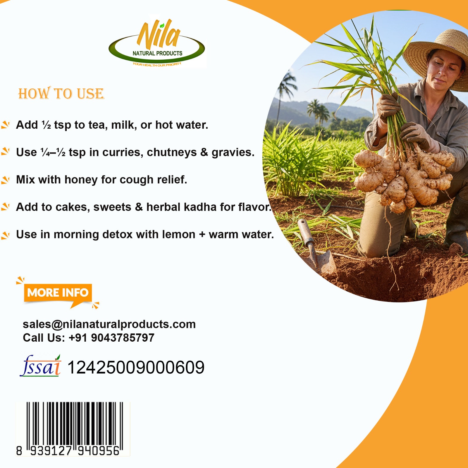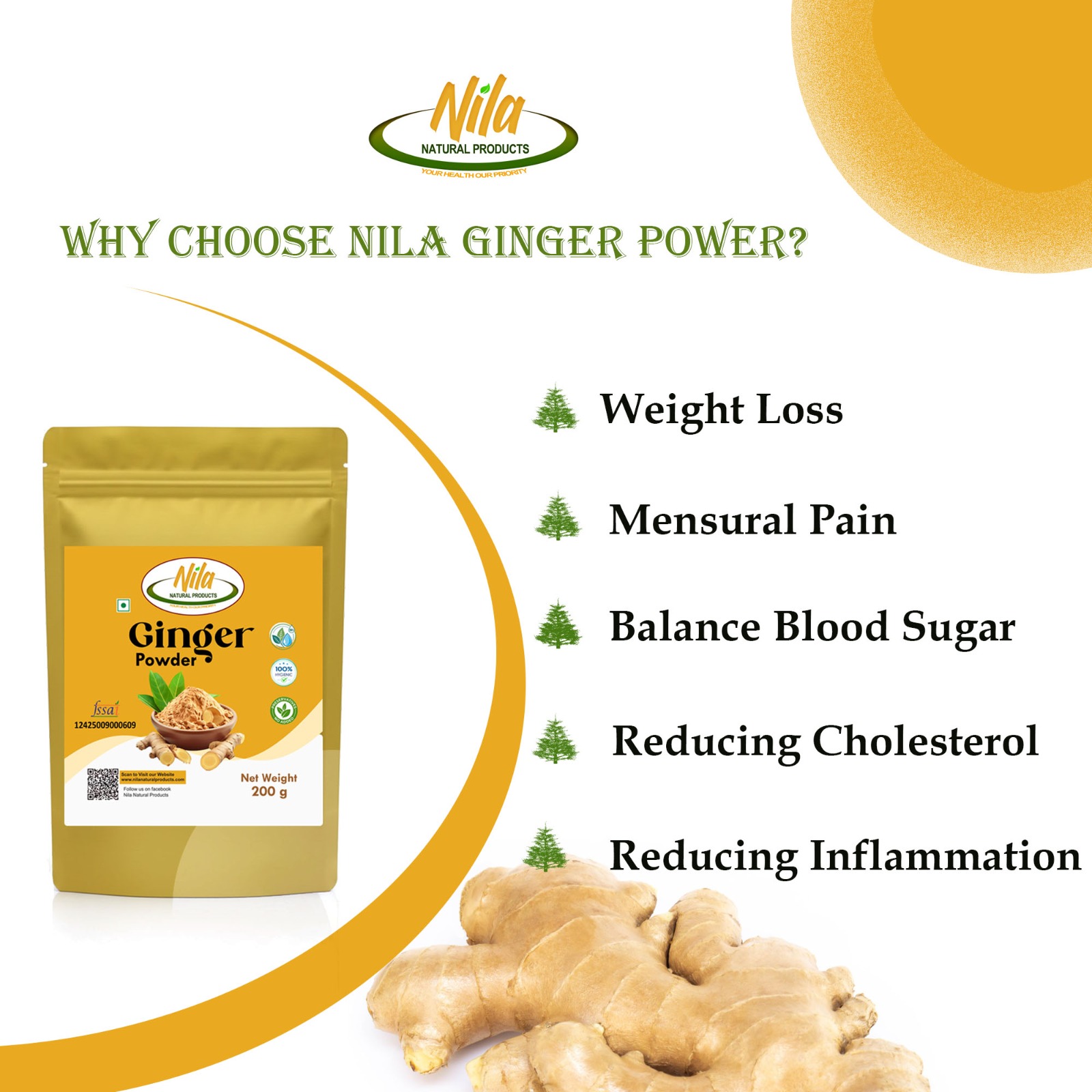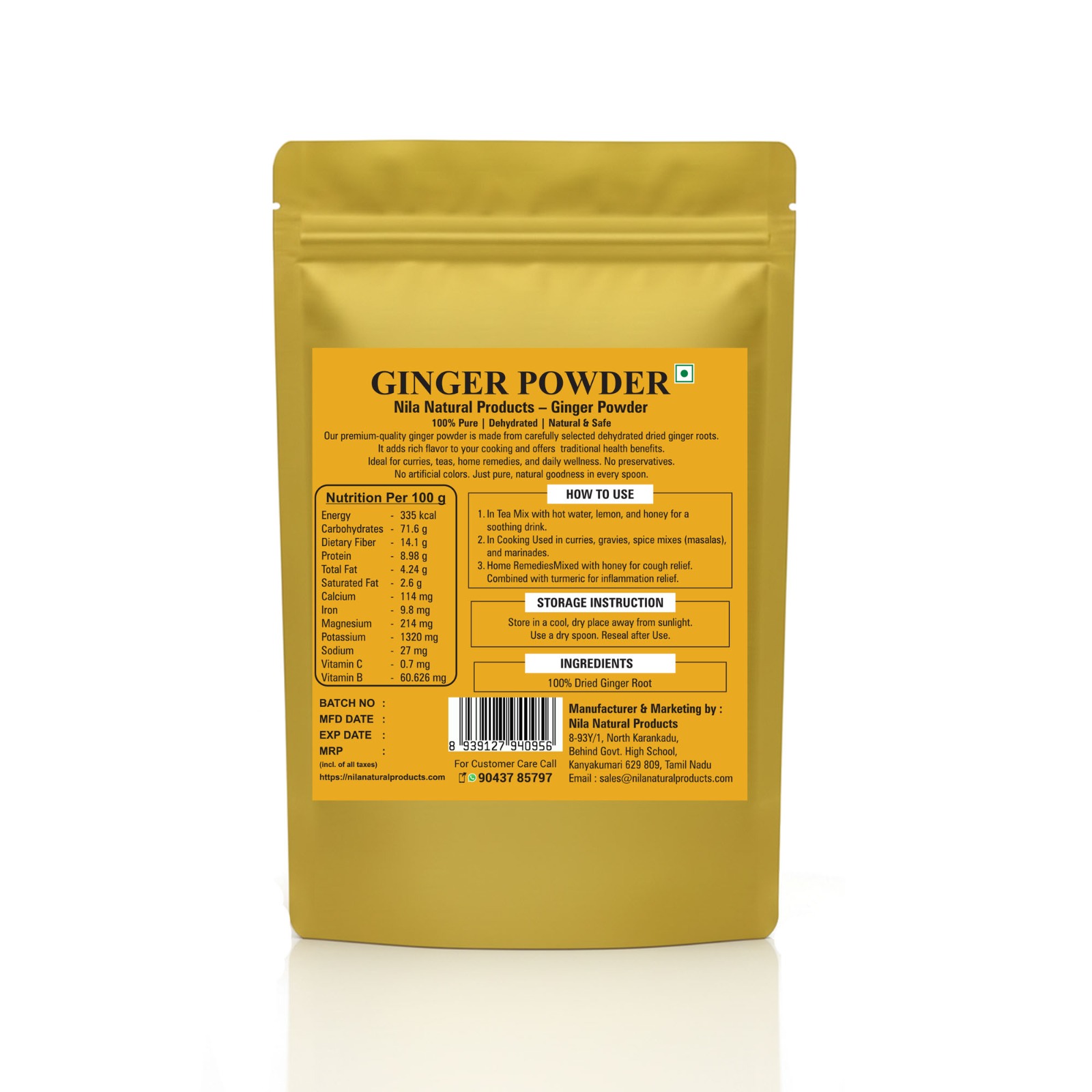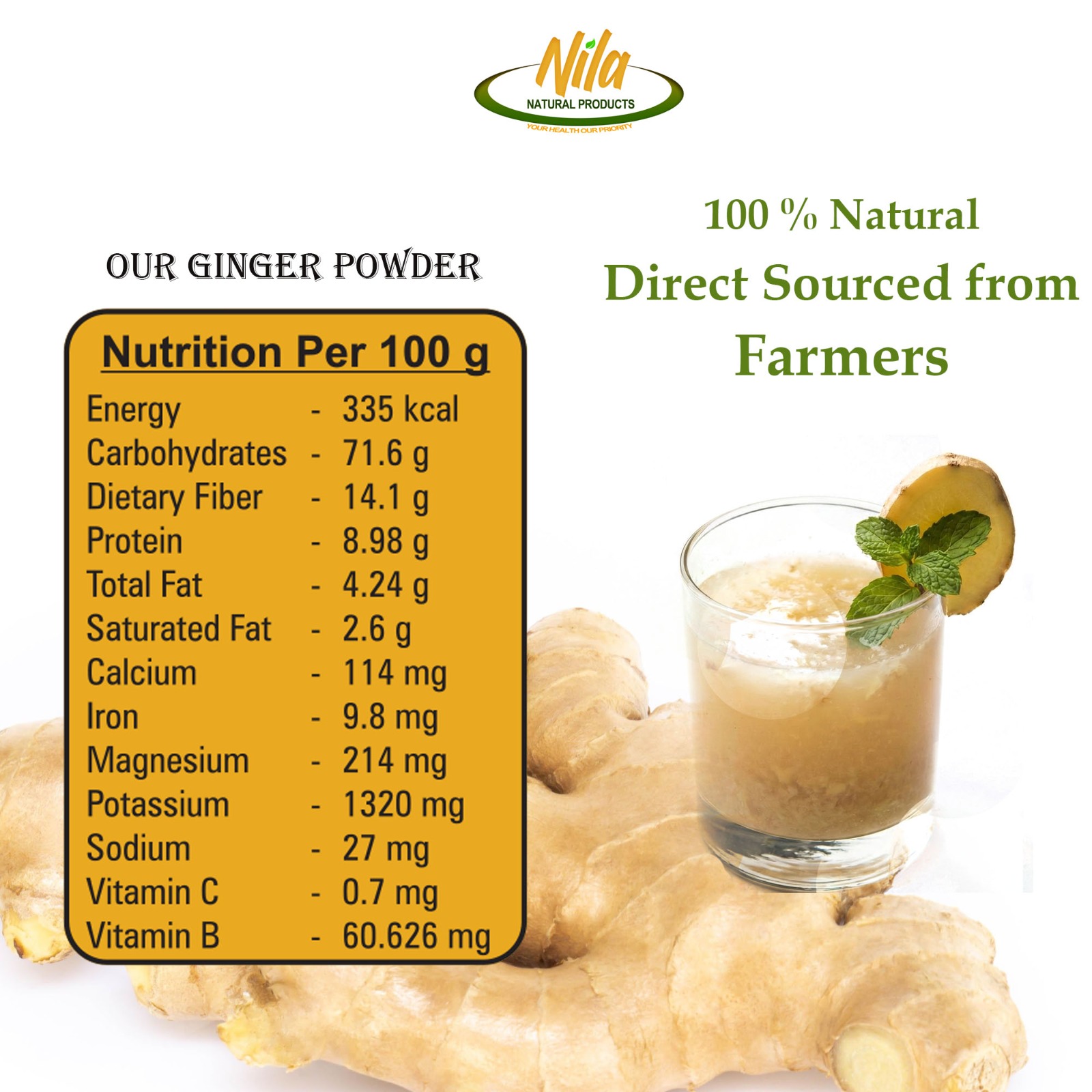 Nila Natural Products Ginger powder is a finely ground, dried form of Zingiber officinale root, widely used as a spice, flavoring agent, and natural remedy. It carries a warm, zesty, and slightly sweet aroma with a sharp, spicy undertone. Pale yellow to light brown in color, ginger powder dissolves easily into liquids and blends smoothly into dry mixes, making it a versatile ingredient in both culinary and wellness applications.